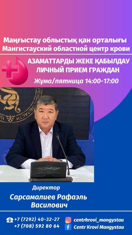 • Областной центр крови  обращается ко всем жителям города Актау и Мангистауской области пополнить ряды доноров крови для обеспечения потребностей лечебных учреждений необходимым объёмом крови. Приглашаем желающих сдать кровь всех группы…