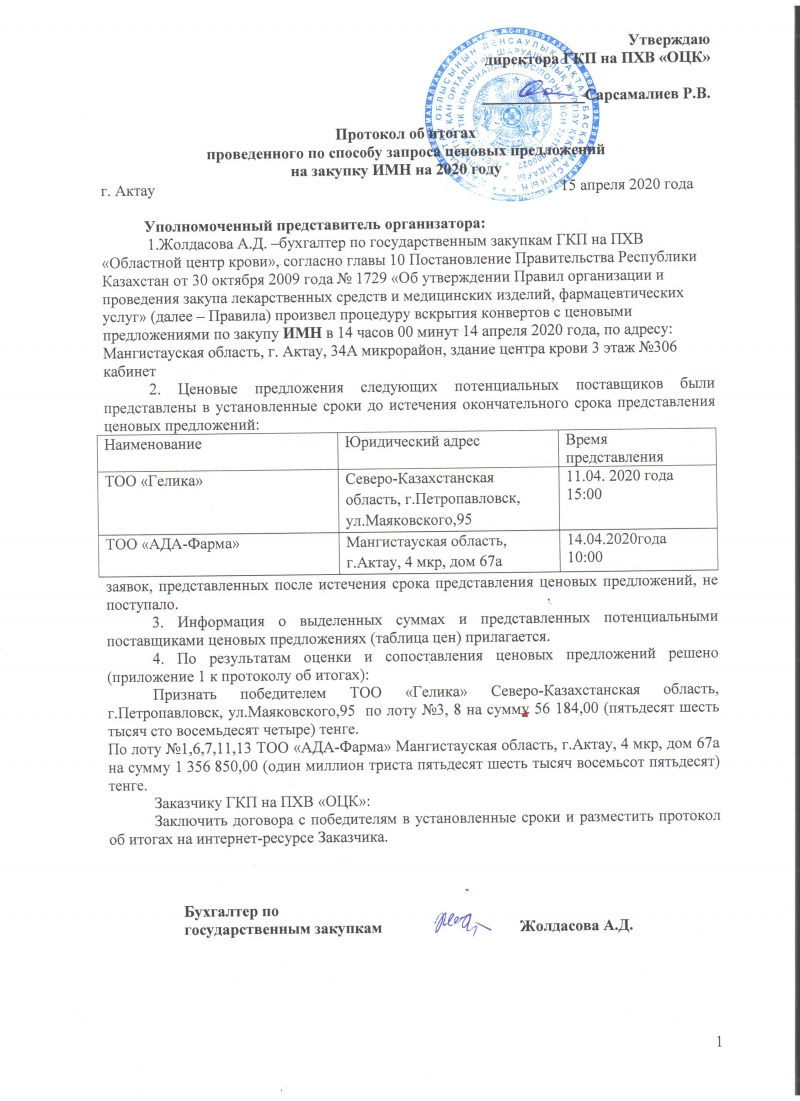 Протокол об итогах проведенного по способу запроса ценовых предложений на закупку ИМН на 2020 году от 15.04.2020 г.