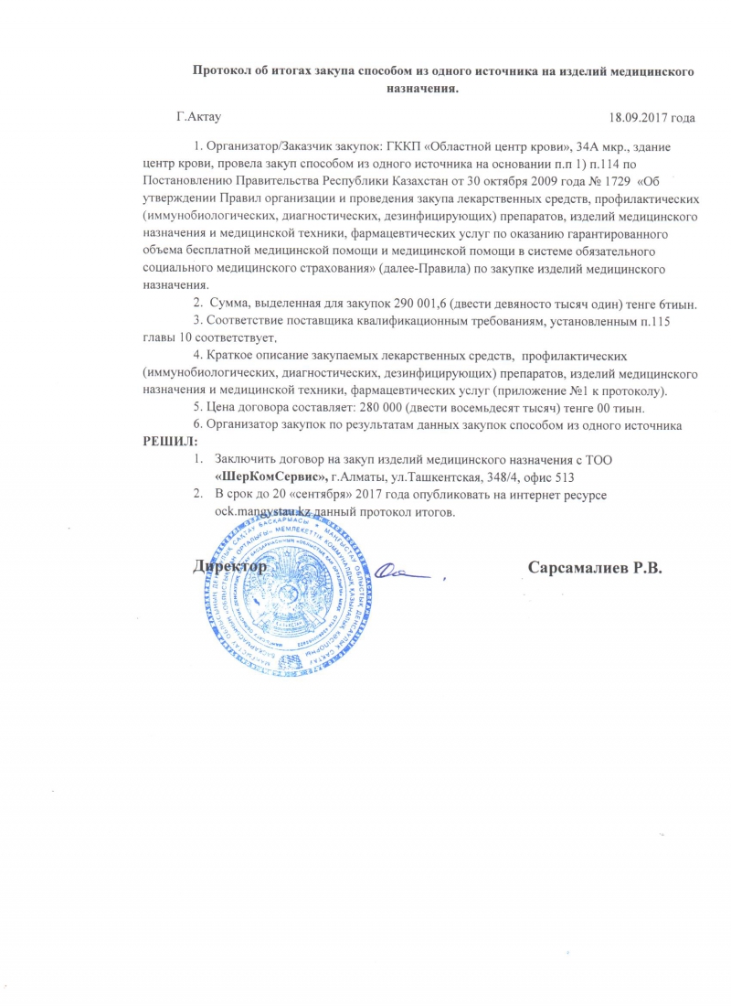 Протокол об итогах проведения закупа способом из одного источника на изделия медицинского назначения
