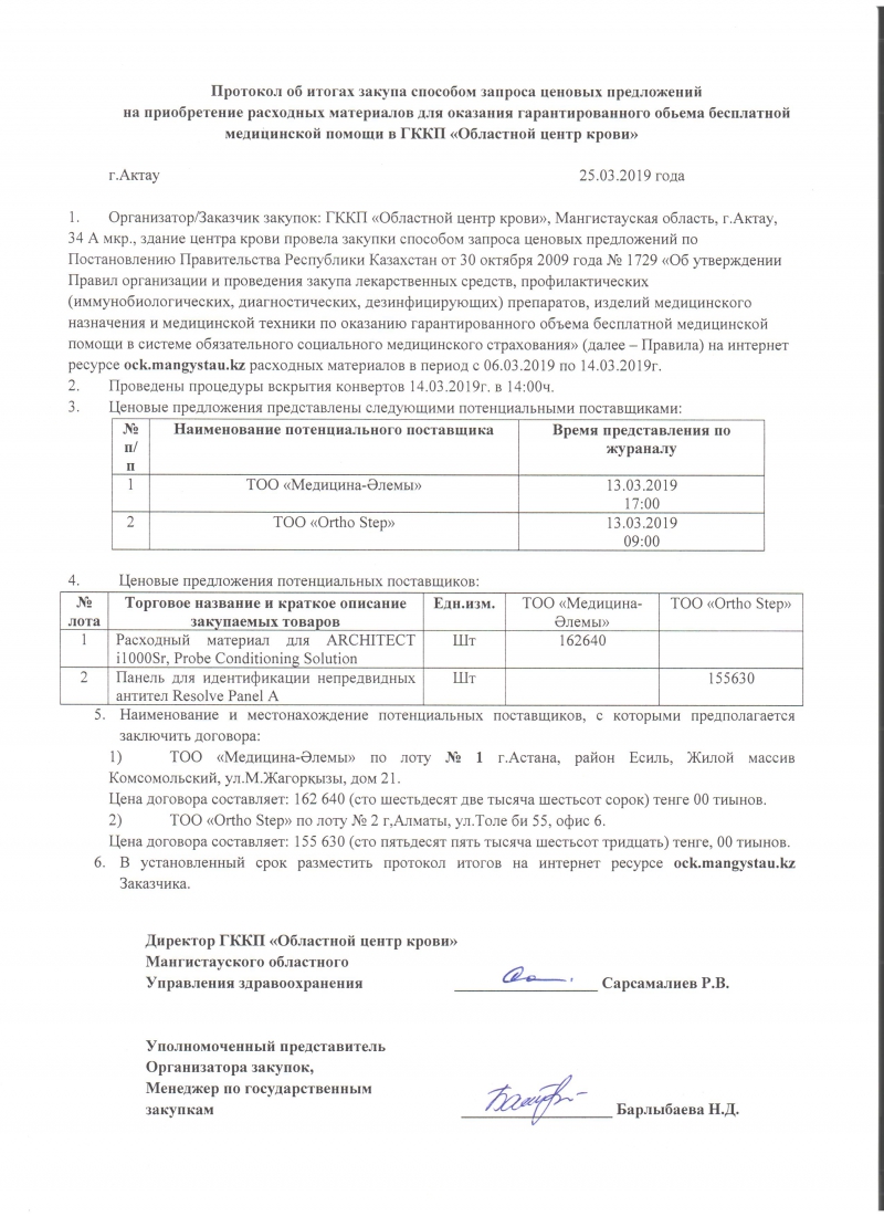 Протокол об итогах закупа способом запроса ценовых предложений на приобретение расходных материалов для оказания гарантированного объема бесплатной медицинской помощи в ГККП "Областной центр крови" от 25.03.2019 года